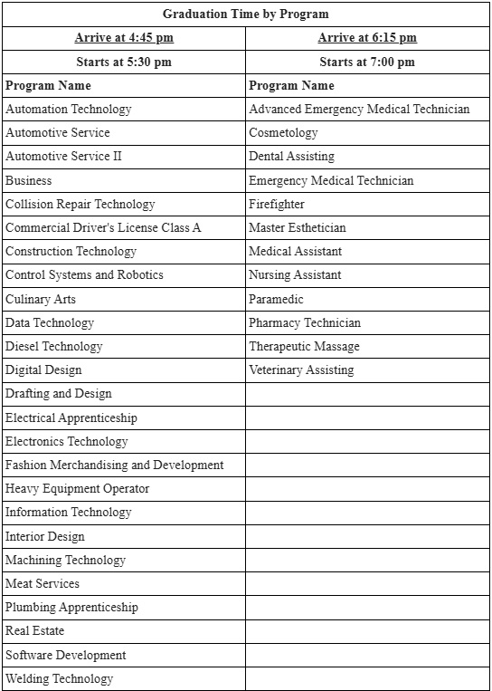 Please arrive 45 minutes before your designated ceremony time to check in for the procession line up to be recognized at the presentation of graduates. Guests should be seated ten minutes before the start time, we will start promptly. You will also have a complimentary graduate photo taken during the recognition of graduates.